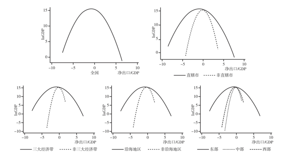 本文构造的理论模型和计量模拟结果显示,我国三大经济带、东中西部和城市群间开放度的差异赋予地区间经济增长的独特动力机制。净出口与经济增长的非线性关系形态则蕴含了该机制的复杂性。其一,在直辖市、三大经济带和东部地区等开放程度较高的经济区域内,抛物线同X轴的左右端点区间跨度、lnGDP的极大值明显大于或高于其他地区直至全国平均水平,其中依托边境开放的西部地区还大于或高于中部地区,这表明开放经济构造了净出口依存度制约lnGDP增长的基本动力,并赋予经济增长以更大的空间和潜力。其二,尽管开放经济语境中抛物线的极值点显著地高于封闭经济,但它却更早地达到极值点后减速,这显示了经济开放推动GDP增长存在着复杂的作用机制。其三,净出口对于经济增长速度的临界转变点围绕贸易均衡值摆动,除了出口对于经济增长作用的传统理解,显示了进口和出口分别带来的各种贸易利得及其对经济增长的综合作用,共同揭示了贸易同经济增长的复杂而又新型的计量经济学关系。见下图: