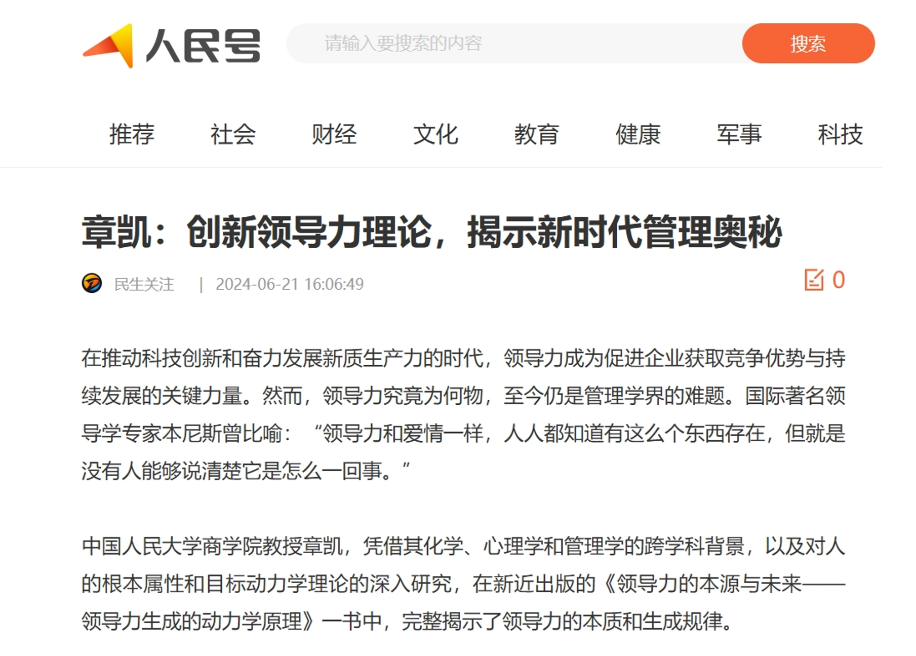 有三位德高望重的学者为本书的出版亲笔作序,隆重推荐。浙江大学文科资深教授、国际应用心理学会会士王重鸣先生如此评价此书:“章凯教授在系统综述相关研究文献的基础上,结合自己独特的思考、研究、分析和检验,创新性地提出了一套新的领导理论——领导协同论。这一全新的领导协同论为领导实践与未来发展提供了重要的理论指导,值得大家仔细阅读、主动参考和广泛应用。”华盛顿大学工商管理讲席教授、美国管理学会会士陈晓萍教授认为此书“从哲学和科学的角度分析批判了近一百年来积累的五花八门的所谓领导力理论之后,进行了构建自己的领导力模型的探索,提出了领导协同论,以此整合了以往大部分碎片化的领导理论”。中国管理科学学会领导力专业委员会主任、中国领导科学研究会学术委员会副主任李凯城认为,“对所有想通过学习理论提升领导力的读者来说,本书由浅入深、层层递进的剖析,其启发作用和实用价值都不言而喻”。本书出版后引起了非常积极的社会反响。例如,华为公司为中高层HR经理人员批量购买,我院MBA同学争相购买,重庆市医院协会运营管理专业委员会购买此书作为会议资料赠送给200多名与会的专家领导。人民号、中国网、中国科学网、中华网等全国性官方网络媒体对此进行了长篇报道。
