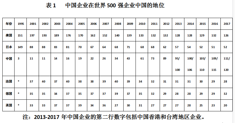 二十多年前我们开始研究中国的大企业,那时我们没有一家能走向世界舞台。1995年才开始有3家公司入围世界500强,到2005年19家,其后逐年快速增加,2015年103家,到2017年111家,包含香港台湾企业达到120家,与美国企业数只差6家,是日本企业的一倍还多,中国大企业的成长正迅速改变着世界经济的地图和企业实力的格局。