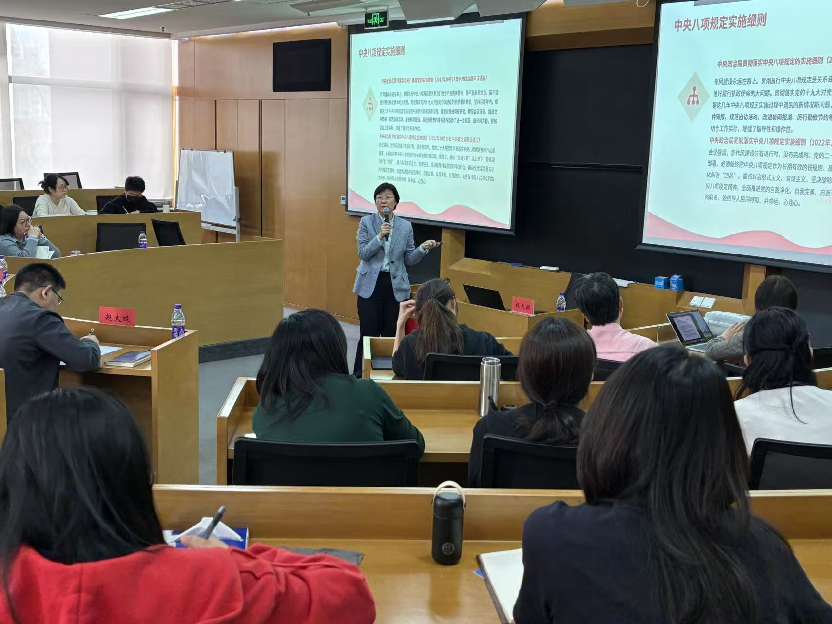 旋天颖作《锲而不舍落实中央八项规定精神》主题培训,围绕党中央开展深入贯彻中央八项规定精神学习教育的重大意义和目标要求、中央八项规定精神内涵、违反中央八项规定精神的具体表现及典型案例、相关党纪条规与惩处措施、学院推进全面从严治党的工作举措等方面进行了全面、详细的讲解。她表示,中央八项规定精神是纵深推进全面从严治党的重要举措,是从严治党长期有效的铁规矩、硬杠杠。学院以深入贯彻中央八项规定精神学习教育为契机,在全院教职工中全面开展纪律教育,强化作风建设,以作风建设推进党风院风、教风学风、师德师风建设。项目中心员工要立足本职本岗,进一步明确岗位职责、查找工作风险点、梳理完善制度机制、提升管理服务水平。在严守纪律底线的基础上,积极干事创业、勇于担当作为,不断提高专业学位研究生培养质量,推动项目健康发展。学院将不断完善制度体系,压实责任体系,加强教育培训,强化处置力度,以更高标准、更严要求,持之以恒落实中央八项规定精神,为学院各项事业高质量发展营造风清气正的政治生态,为推进教育强国建设、走好建设中国特色世界一流大学新路凝聚奋进力量。