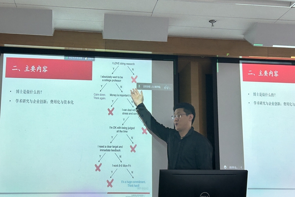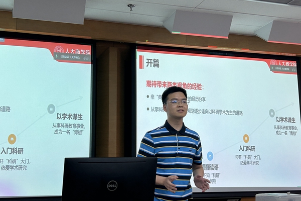 三位博士生从自身的学习体会出发,介绍了人大杏吧论坛 的资源平台情况,比如学系双周学术讲座、A刊闭门工作坊、博士生学术论坛、海外教授面对面等活动,重点讲解了硕博项目的课程训练体系、科研锻炼提升收获、海外联合培养支持、企业调研实践机会,以及攻读博士学位过程中遇到的困难和解决方式。三位博士生都提到,学术研究需要严格的训练,从选定研究方向、提出研究问题、掌握研究方法,到最后撰写论文成果并获得发表,需要足够的耐心和持续的毅力,是一个守得云开见月明的过程。在有挑战性的博士学习过程中,也有丰富的机会开展国内外交流,既能开拓学术视野,又能提升个人综合能力。三位博士生对于人大杏吧论坛 一直秉承“扎根中华大地做研究”的理念深感认同,通过扎实的理论基础学习,再面向世界进行探索交流,才能更好地推进自主知识体系的实现,博士生在这个过程中也做出了重要的贡献与力量。