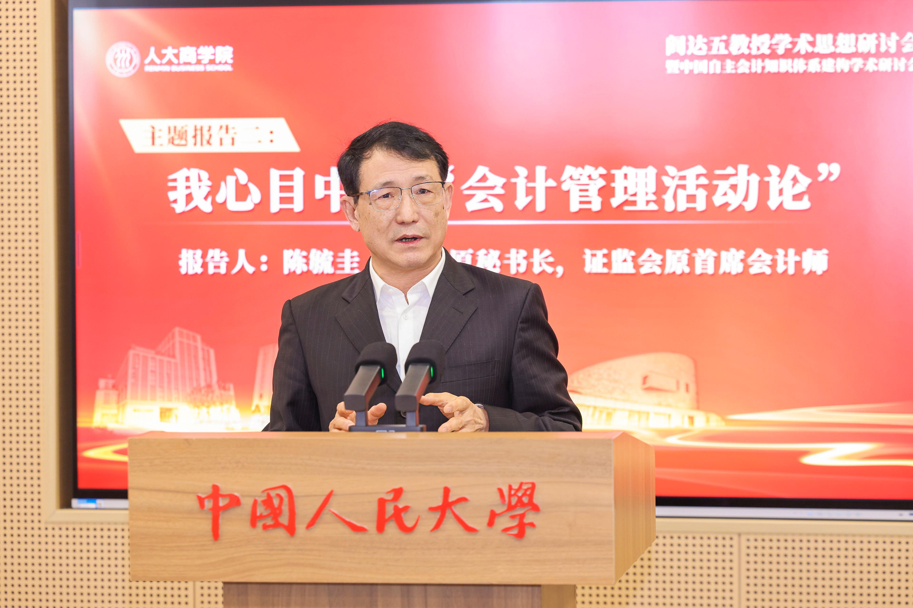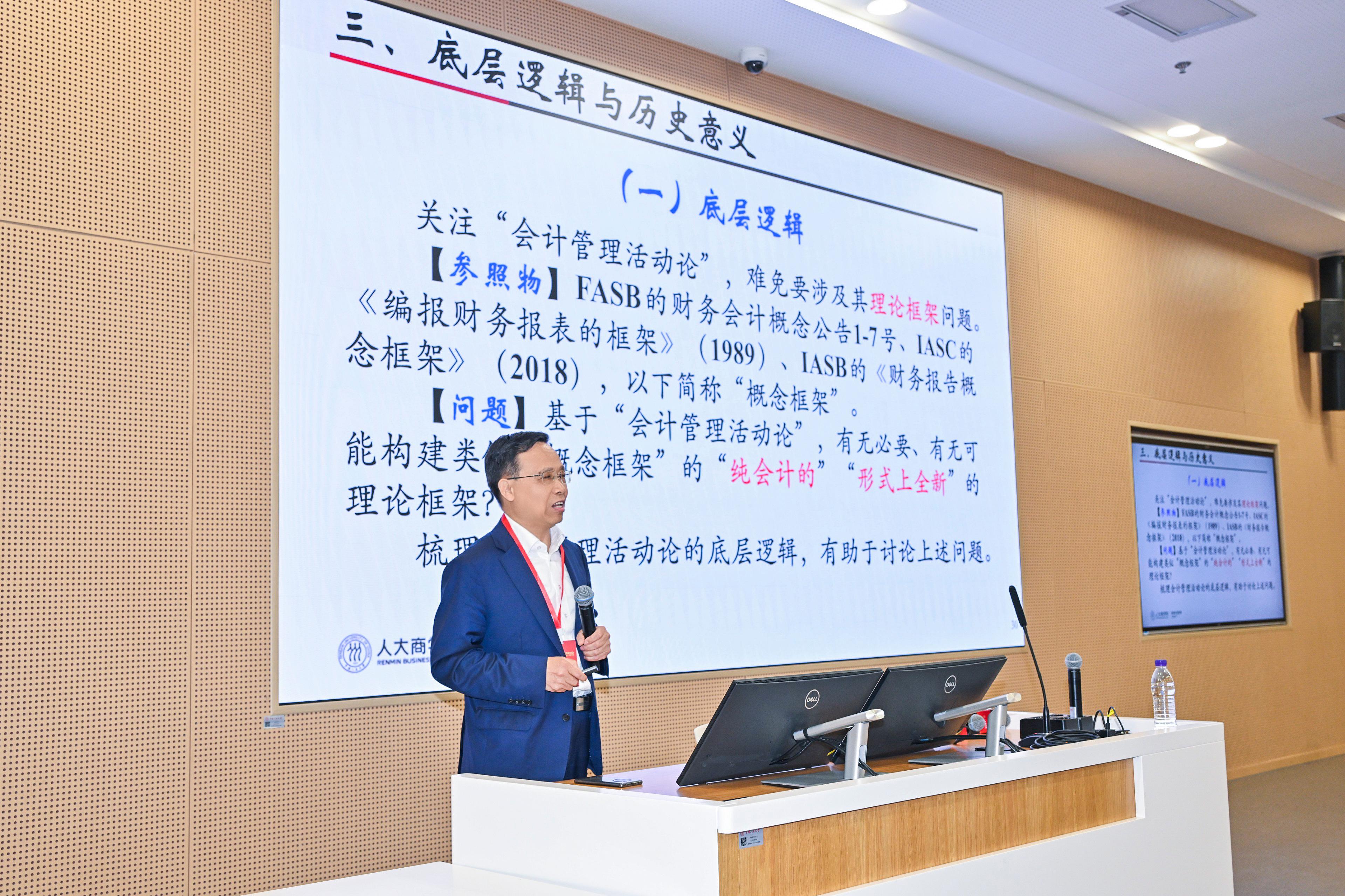 陈毓圭在报告中深刻阐释“会计管理活动论”的时代价值与理论地位,提出该理论是广大会计人员安身立命之论、会计哲学之论、开拓会计研究新境界的旗帜之论。他指出,杨纪琬、阎达五提出的“会计是管理活动”,是会计思想史上第四个重要哲学坐标,明确会计具有反映与监督两大基本职能,深刻回答“会计是什么”的根本问题。该理论立足中国实践,为会计工作与学术研究指明方向,是建构中国自主会计知识体系的重要思想源泉。