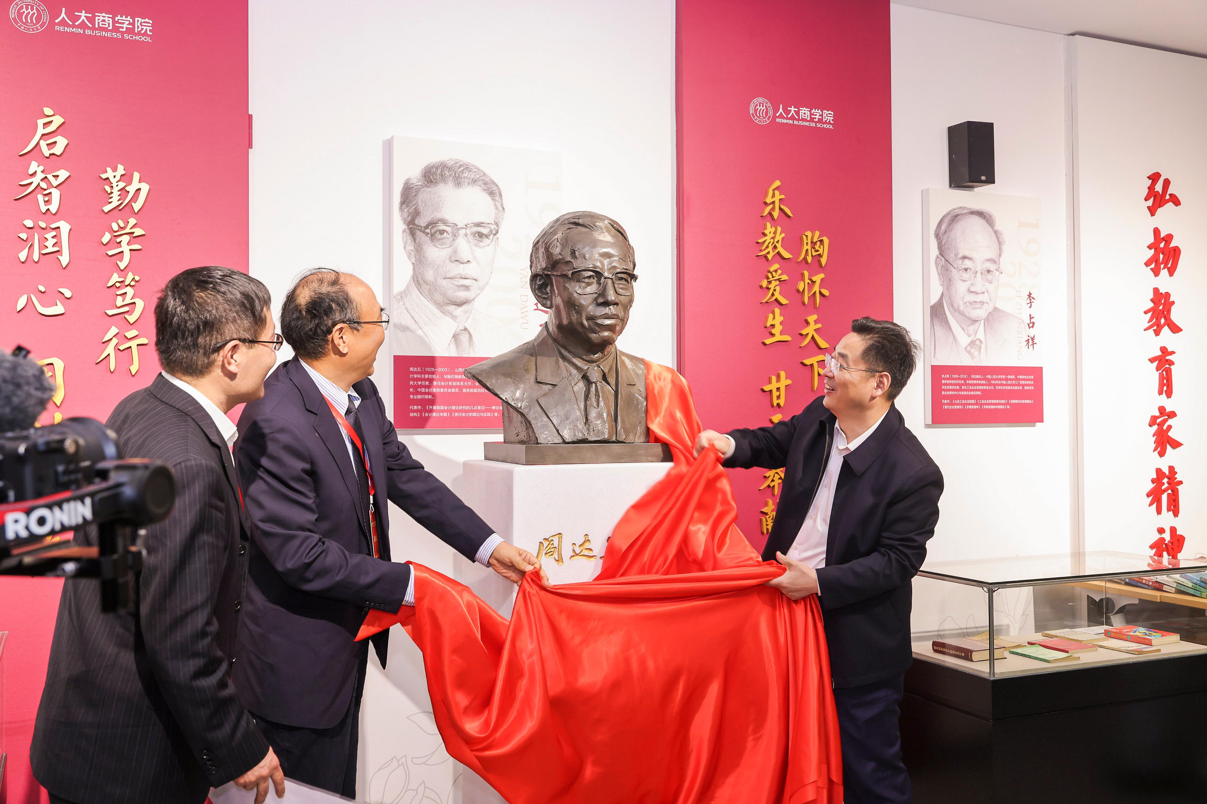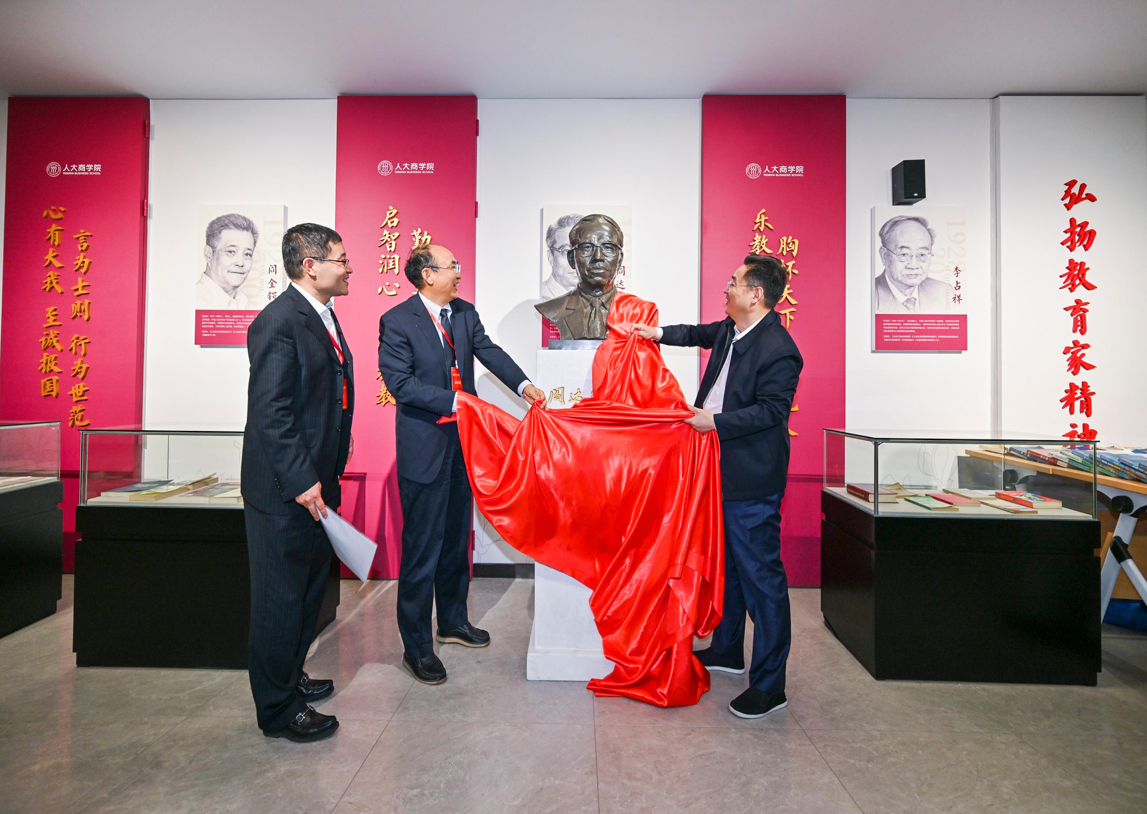 随后,阎达五教授塑像揭幕仪式在通州校区商学楼举行。朱信凯、支晓强、周明德共同为塑像揭幕。