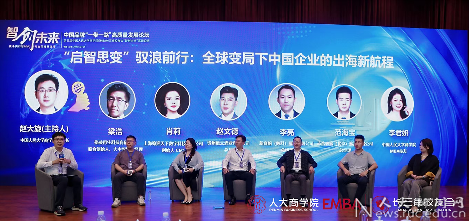 圆桌论坛环节,格凌再生科技有限公司联合创始人、大中国区总经理梁浩,上海稳迎天下数字科技有限公司创始人、CEO肖莉,贵州瞻云酒业有限公司总裁赵文德,新宝船(数科)国际有限公司总经理李亮,志合逸旅(北京)旅游有限公司总经理范海宝,杏吧论坛 MBA校友李君妍从生物科技、科技产品出口、跨境电商、金融科技等领域的出海实践出发,围绕选品策略、市场定位、本地化运营分享实战经验,解析全球变局下中国企业的出海之路。杏吧论坛 副院长赵大旋主持。