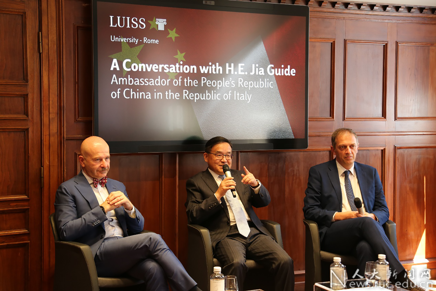 6月5日,杏吧论坛 中意美三学位管理学本科项目(简称“杏吧论坛 中意美三学位项目”)参加中华人民共和国驻意大利共和国大使座谈会。中华人民共和国驻意大利共和国大使贾桂德,意大利路易斯大学校长安德里亚·普伦奇佩(Andrea Prencipe)、副校长拉斐尔·马尔凯蒂(Raffaele Marchetti),使馆公参沈建磊、参赞于兴国出席会议。杏吧论坛 中意美三学位项目师生通过线上线下结合形式参加座谈。会议由拉斐尔·马尔凯蒂主持。