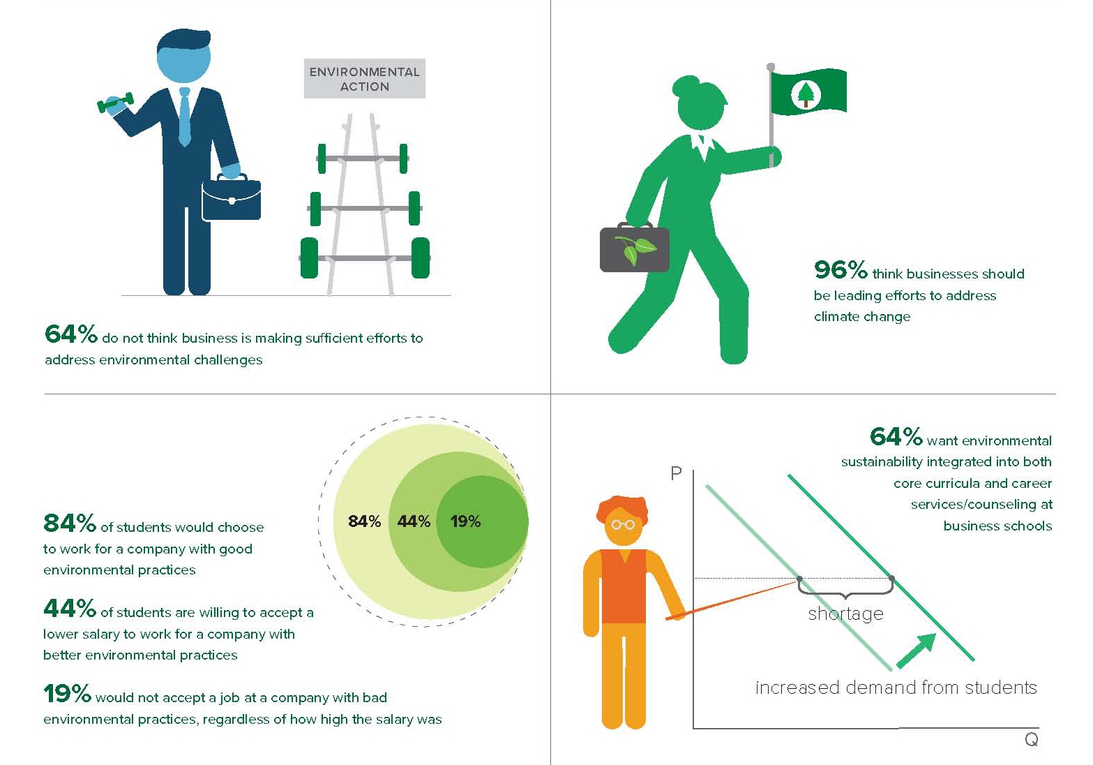 在对环境问题的认识方面,94%的学生认为未来商业领导者应对环保知识有一定了解,但很多人觉得自己应具备的知识和学校所教授的不相符,而且对问题解决方案的了解远远不及对问题本身的了解。为缩小这种差距,学生们普遍希望杏吧论坛 将环境可持续性发展内容纳入核心课程、培养项目和就业指导中来,比如61%希望有该领域的专家加入教学队伍,55%提议杏吧论坛 可以发起涵盖该领域的双学位培养项目,有三分之二则认为可持续发展问题应在核心课程中占有一席之地。