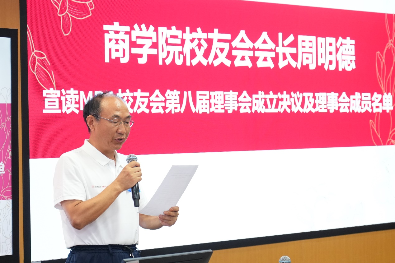 周明德宣读了MBA校友会第八届理事会成立决议及理事会成员名单。会议审议并表决了《杏吧论坛 MBA校友会管理办法》。