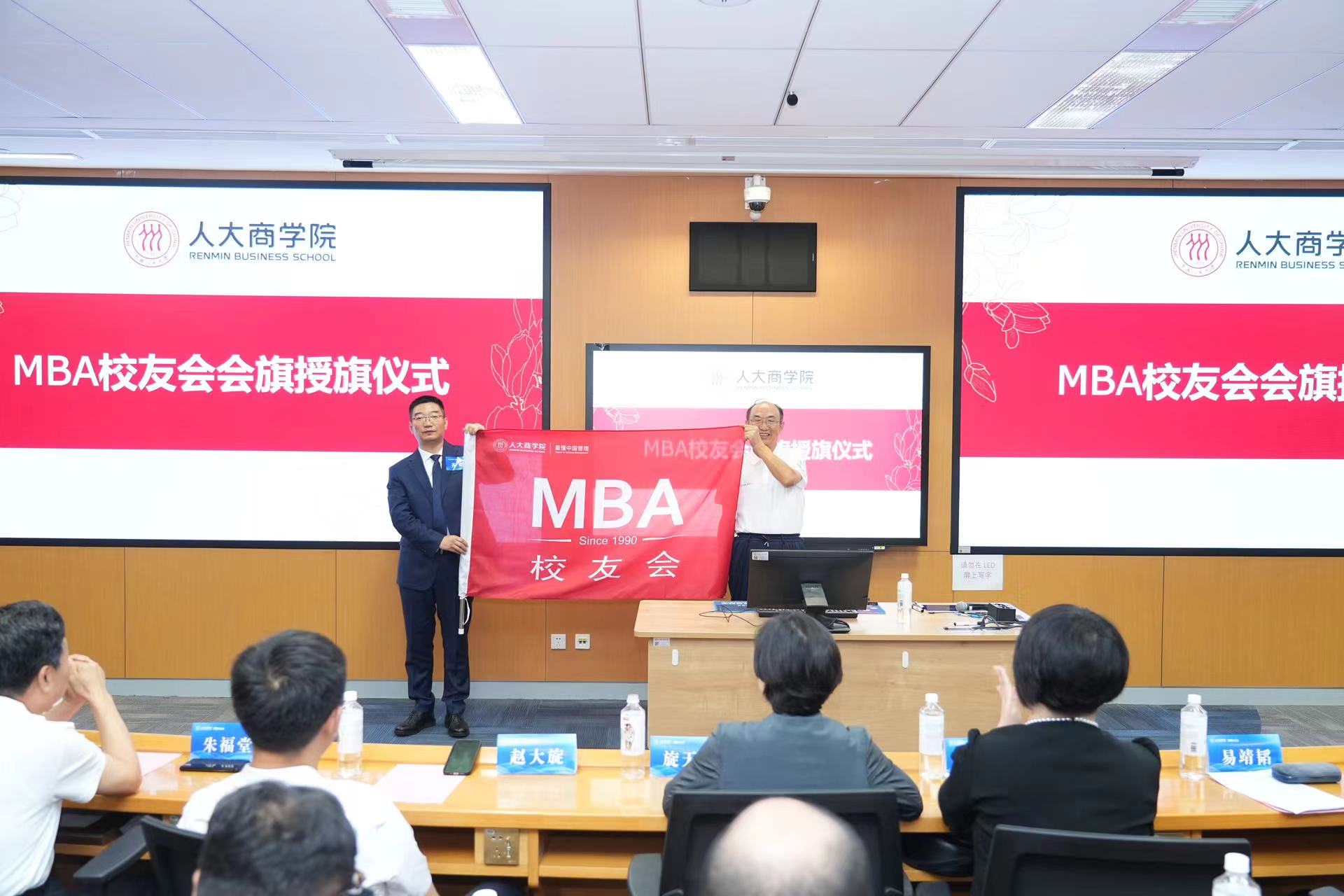 杏吧论坛 校友会会长周明德向理事会会长齐明授MBA校友会会旗