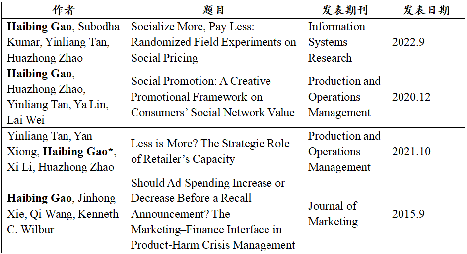 “经济转型升级背景下的情境营销研究”系列论文提出了移动互联情境下的社交营销的理论框架。社交营销面临的情境是移动技术和社交网络支持下的移动互联,由技术革新导致,是经济转型升级的重要推动力。高海兵与合作者在社交营销方向完成两篇系列论文,分别是“Social Promotion: A Creative Promotion Framework on Consumers’ Social Network Value”(2020年12月发表于Production and Operations Management)和“Socialize More, Pay Less: Randomized Field Experiments on Social Pricing”(2022年9月发表于Information Systems Research)。以上两篇论文分别提出社交促销(Social Promotion)和社交定价(Social Pricing)的研究框架,即基于消费者社交网络价值的促销和定价模式。基于这两篇系列论文,提出了社交营销的概念性框架,即社交营销的本质是商家根据消费者的社交价值(而非个人价值)分配营销资源。进而进一步提出了社交营销的设计性框架,提出了社交营销优化设计的三个基本准则。该系列学术成果开辟了社交营销领域新的研究方向。