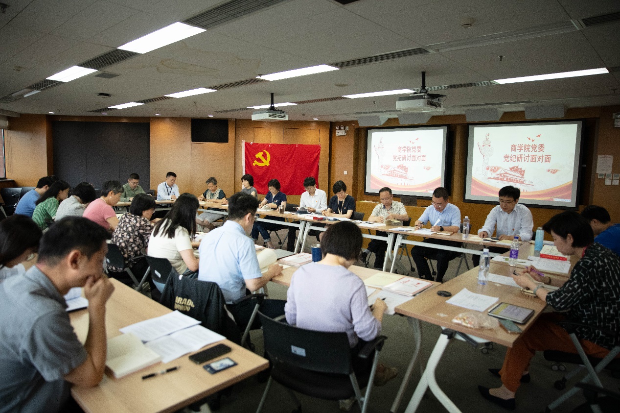 在专题发言环节,企业管理系教师党支部书记何文龙、行政教职工第四及延期博士党支部党员卢筱佳、行政教职工第三党支部书记王丹、2020级博士生3班党支部书记苏聿桢、行政教职工第二党支部书记柳晓妮、贸易经济系教师党支部石明明、管理科学与工程系教师党支部组织委员周京梅围绕《条例》有关条款和内容作了深入解析,并结合具体案例分享了学习心得和体会。