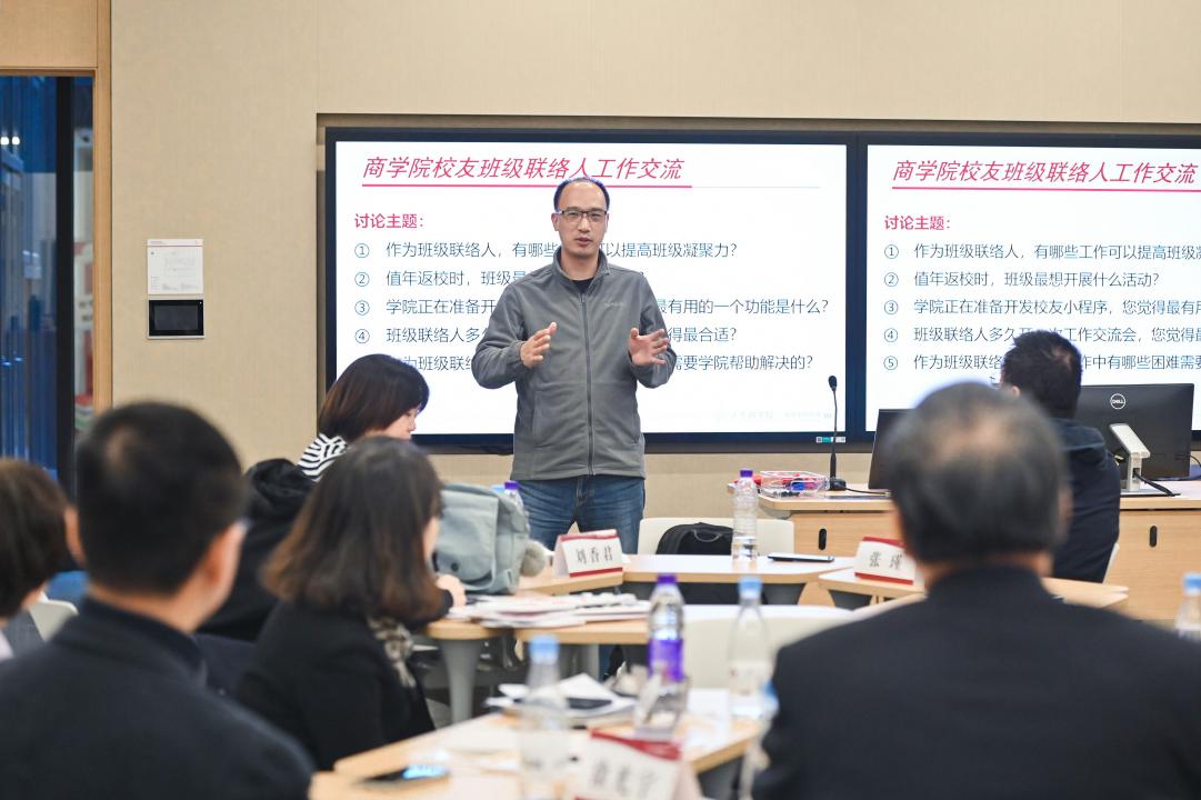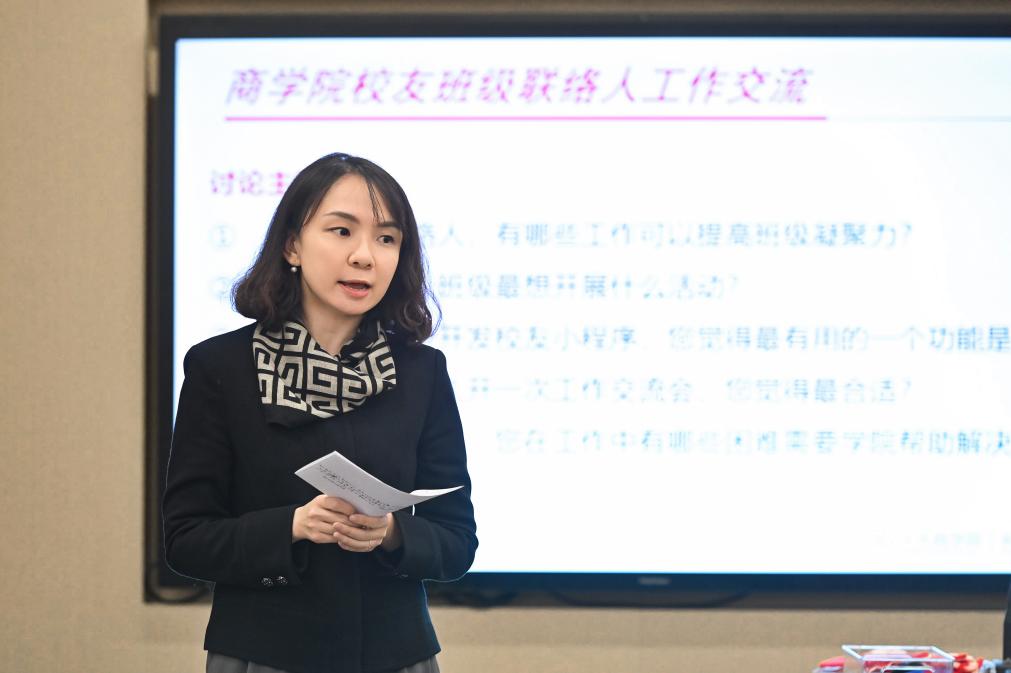 张瑾为校友班级联络人介绍了学院最新战略发展规划,并表示,班级联络人是学院与广大校友之间最坚实的桥梁纽带,是凝聚校友力量、传承学院精神的核心骨干,感谢长期以来致力于校友联络工作的校友们,希望大家持续关心和助力学院事业发展,学院也将持续陪伴和赋能校友成长。
