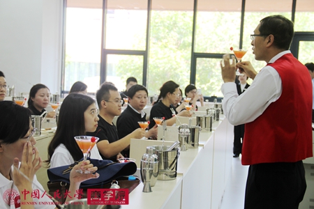 仪式后,校友们合影留念,然后在学生志愿者的带领下,兵分三路,分别体验了葡萄酒品鉴、鸡尾酒调制、西餐商务礼仪三堂增加生活幸福感的体验课程。