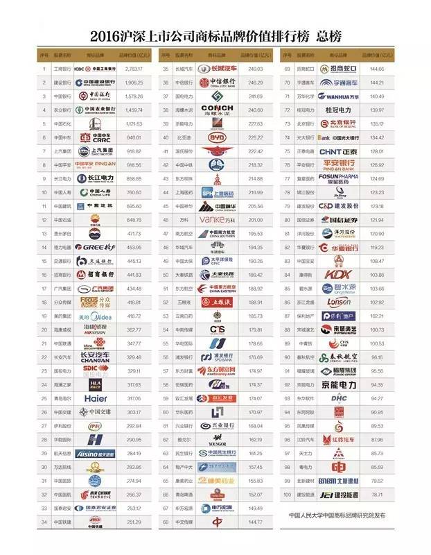 上市公司商标品牌价值总榜“百强”