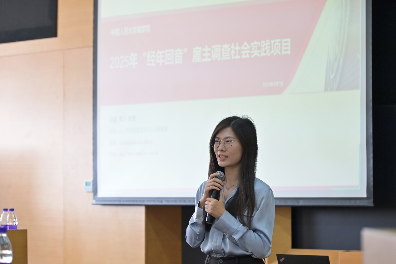 职业发展中心兼校友办公室主任黄微详细阐述了项目的设定背景及创新之处。作为学院重点打造的学生社会实践品牌项目之一,“经年回音”雇主调查旨在通过对用人单位和优秀校友的深度访谈,促进在校学生成长的同时反哺于学院人才培养和教学工作的持续优化升级。“经年回音”项目既有学术指导教师的全程护航、问卷设计的专业度要求、调查对象范围的拓宽,更有以深度访谈为主的调研方法、专业化的报告产出等,确保调查成果有效助力学生的职业规划与发展,为学院的教学改革和学科发展提供有益参考。
