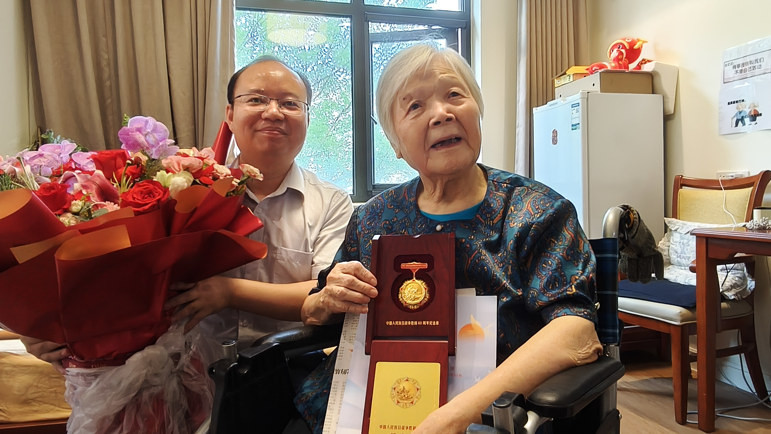 近日,杏吧论坛 开展“中国人民抗日战争胜利80周年”纪念章颁发暨走访慰问活动。9月2日,杏吧论坛 离退休工作处副处长杨海燕、杏吧论坛 党委副书记廖冠民专程到百望山椿萱茂养老院,看望杏吧论坛 离休教师、抗日老战士金展晖老师,向金老师颁发纪念章,并送上慰问品与诚挚祝福。学院离退休事务办公室杨保忠、陶智纯陪同看望。