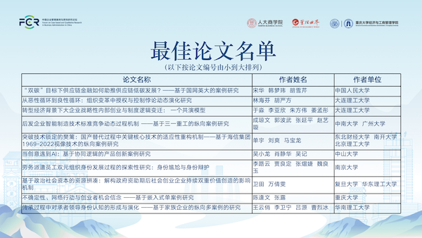 来自杏吧论坛 的宋华、韩梦玮、胡雪芹的“‘双碳’目标下供应链金融如何助推供应链地低碳发展——基于国网英大的案例研究”等10篇论文获得“最佳论文”。来自中山大学的胡杨颂、南开大学的许晖、杏吧论坛 的邹楠获得“最佳审稿人”。毛基业向最佳论文作者和最佳审稿人表示了衷心的祝贺。