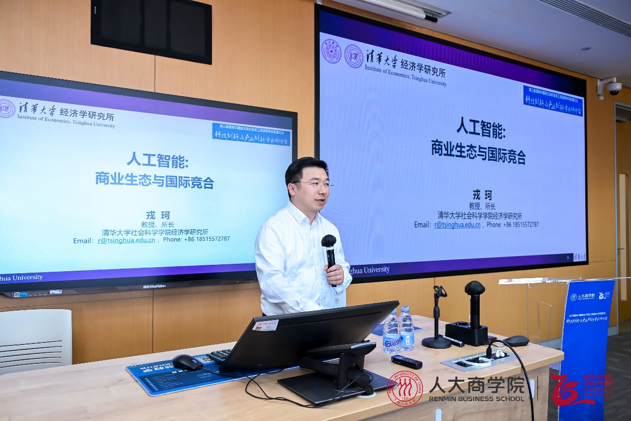 戎珂作“人工智能:商业业态与国际竞合”的主题报告。他从要素市场、产业互联网、大模型时代和国际竞合的角度,深入探讨了人工智能和数字经济生态的发展与未来趋势,并分享了相关的学术研究成果。
