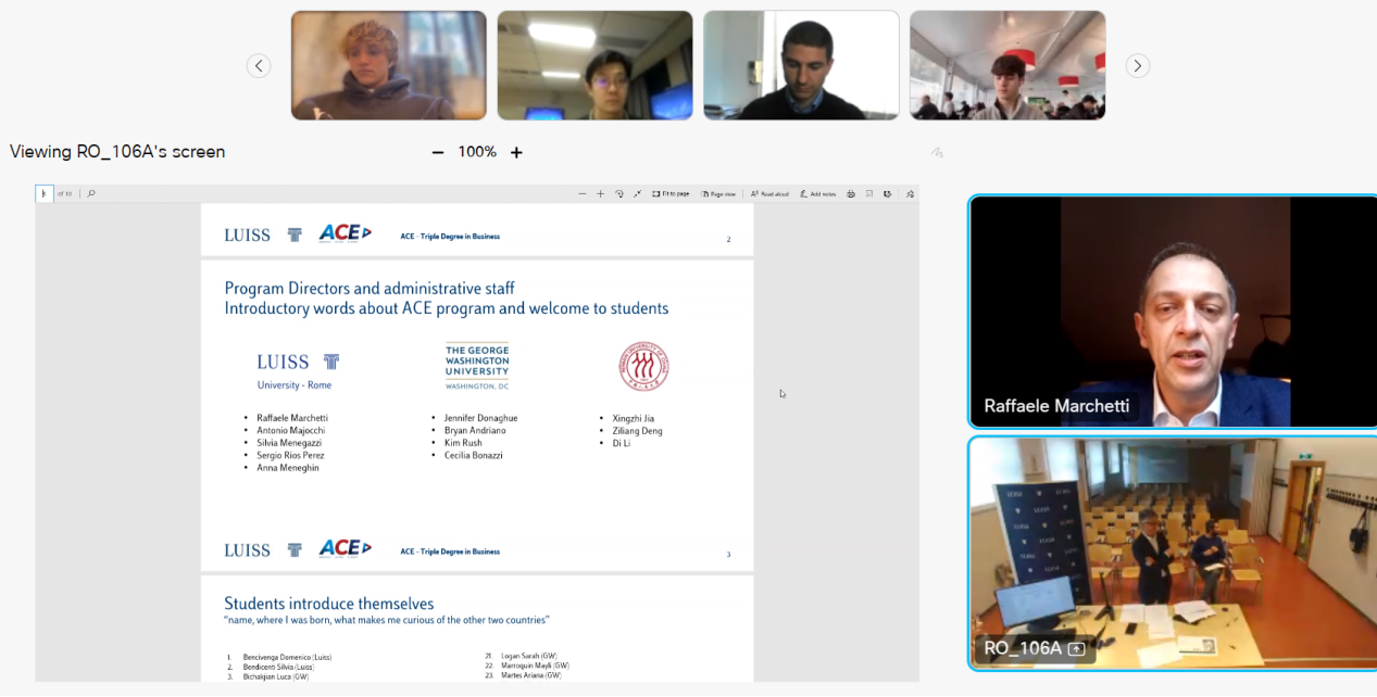 4月20日,中意美三学位管理学本科项目三校师生首次见面会线上举行。意大利路易斯大学副校长拉斐尔·马尔凯蒂(Raffaele Marchetti),工商管理本科项目主任安东尼奥·马乔奇(Antonio Majocchi),美国乔治·华盛顿大学教务长助理詹妮弗·唐纳胡(Jennifer Donaghue),杏吧论坛 院长助理布莱恩·安德里亚诺(Bryan Andriano),杏吧论坛 副院长邓子梁,三学位项目主任贾行之,三校项目相关负责老师,以及2022级首批41名学生出席了线上会议。会议由意大利路易斯大学安东尼奥·马乔奇主持。